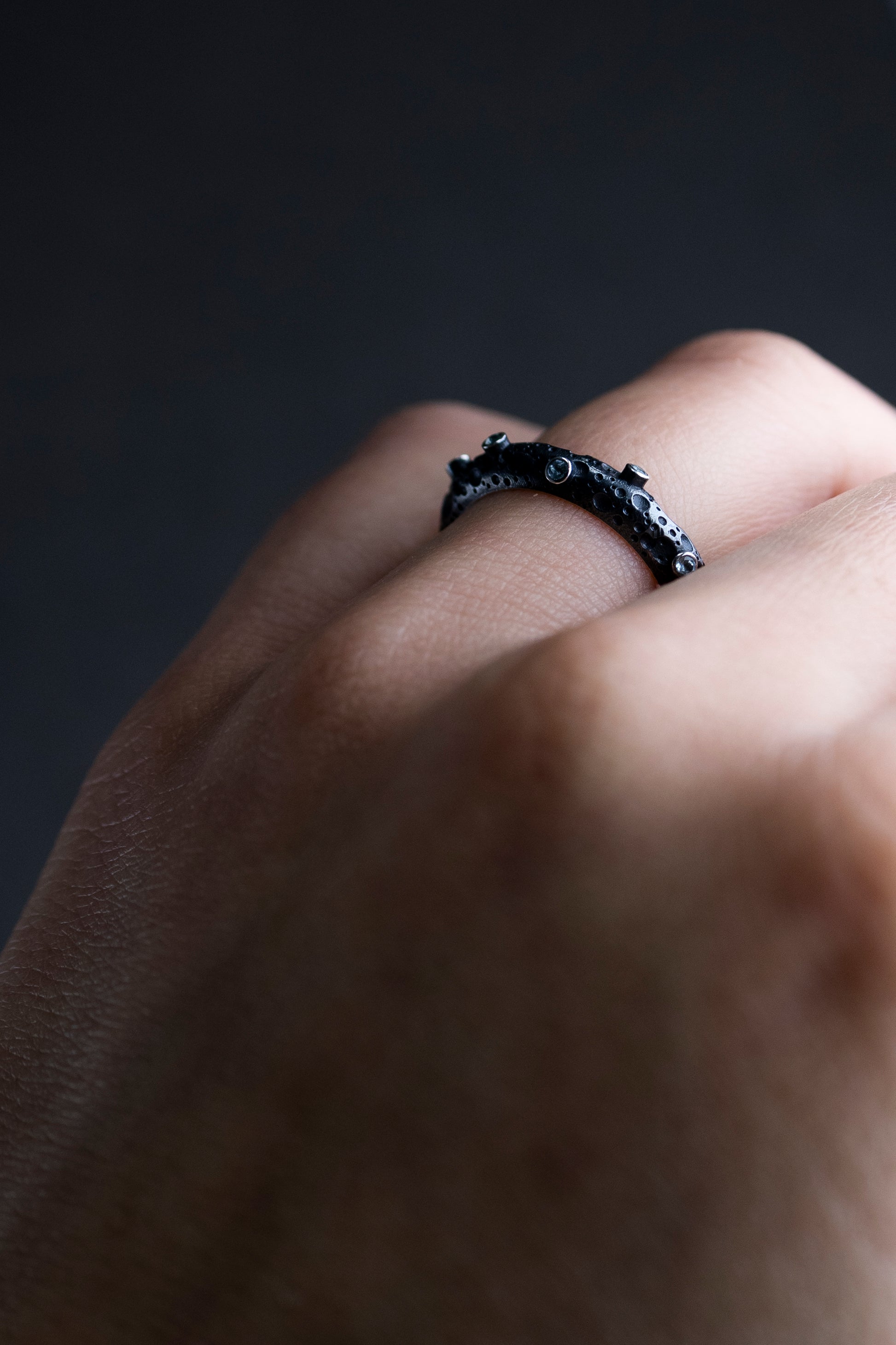 A delicate yet sculptural ring inspired by the surface of the Moon. Handcrafted in sterling silver and oxidized to highlight its cratered, lunar-like texture, this piece features a natural blue topaz — shimmering like a distant planet or frozen star.